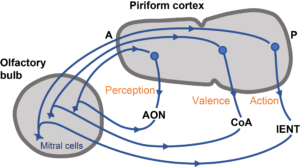Our results support the view that, akin to other sensory modalities, olfactory information leaving the olfactory bulb is segregated into parallel streams that support different computations potentially related to perception, valence and action. In ongoing projects, we test the hypothesis that the olfactory cortex architecture is structured, and thus need not rely on algorithms that assume random connectivity, the relationship to odorant receptors identity and long-range inter-area connectivity.